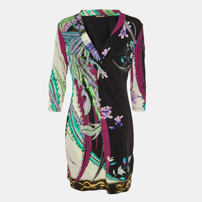 This Roberto Cavalli mini dress is crafted from soft jersey with a vibrant abstract floral print in purple. The knotted waist detail enhances the silhouette, creating a fluid, flattering fit. Ideal for evening outings or daytime glam with a playful twist.