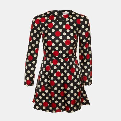 Whimsical yet refined, this RED Valentino mini dress in black silk features a classic polka dot print and feminine detailing. Light, airy, and designed for movement, it’s an easy choice for brunches, date nights, or weekend soirées.