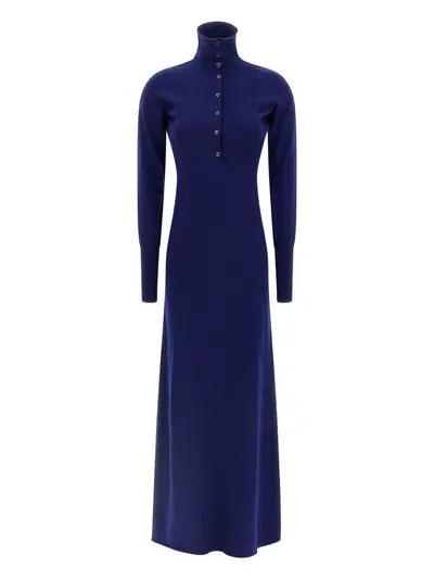 dark blue cashmere fabric flared skirt polo collar button placket cuffed sleeves