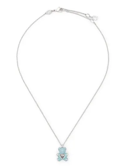 silver and light blue rhodium plated teddy-bear pendant crystal embellishment heart detail chain necklace Normal everyday use and external agents may reduce the lustre of gemstones and gold surfaces. To maintain, use specific, non-abrasive products specially meant for cleaning jewellery.