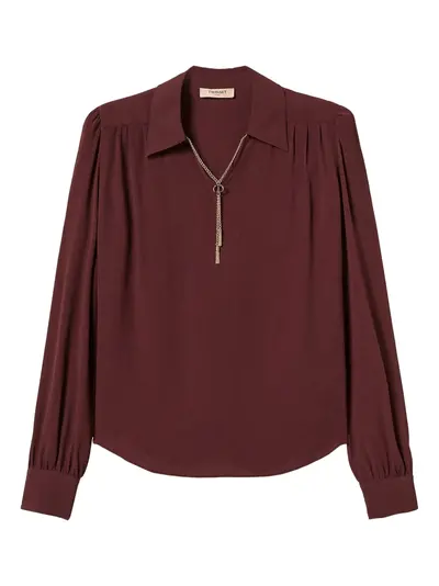 burgundy gathered detailing long sleeves chain embellishment collared neckline