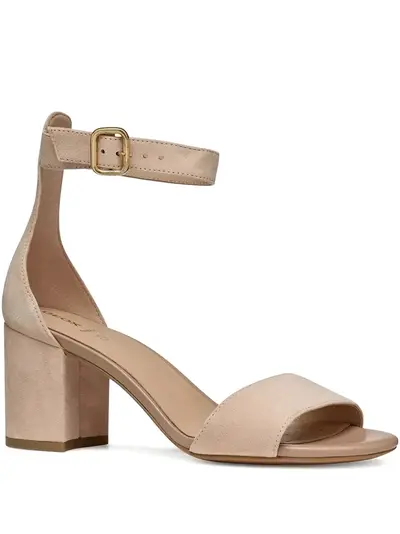 beige suede upper ankle strap buckle fastening block heel open toe