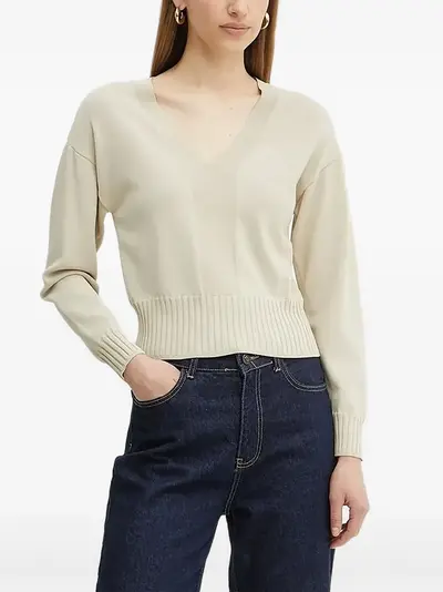 beige v-neck ribbed hem long sleeves ribbed cuffs logo patch