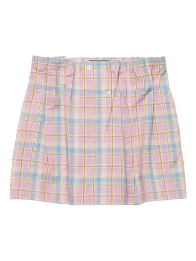 pink checked pattern gathered waist button fastening side pockets cotton fabric