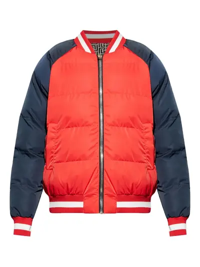 red quilted design baseball collar zip fastening colour-block panelling ribbed hem and cuffs