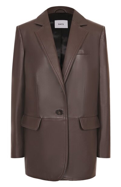 Однобортный жакет с атласным подкладом выполнили из мягкой гладкой кожи. Модель со шлицей сзади и застежкой на пуговицу дополнили прорезным нагрудным карманом и боковыми с клапанами.