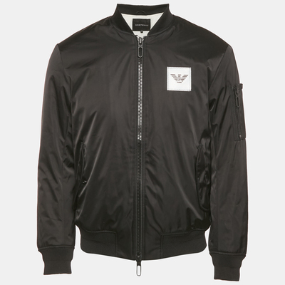 Sleek and sporty, this Emporio Armani bomber jacket is cut from durable black nylon and accented with a tonal logo appliqué. Its modern silhouette and minimal design make it a versatile outerwear essential for effortless everyday cool.