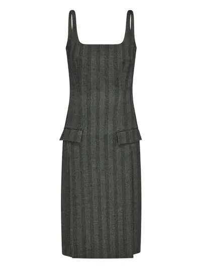 black and grey herringbone pattern square neckline sleeveless flap pockets