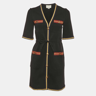 A clean silhouette meets sporty sophistication in this Gucci mini dress. Crafted from black crepe with contrast stripe trims, it blends polish with a subtle athletic edge.