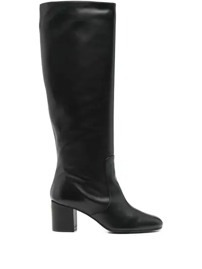 black calf leather block heel knee-high shaft round toe gold-tone logo detail