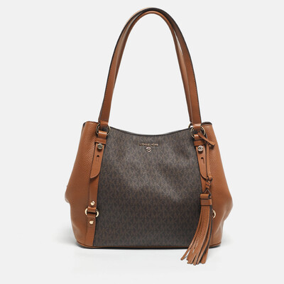 This shoulder bag by Michael Kors is the perfect blend of modern utility and classic branding. Crafted in signature coated canvas with smooth leather, its two tone brown palette offers understated elegance while the spacious interior keeps your daily essentials organized in style.