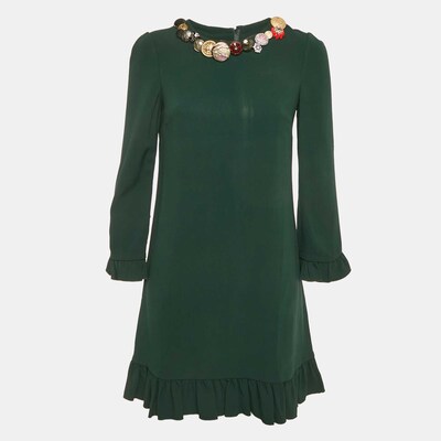 Dolce and Gabbana’s flounce dress in green crepe is elevated with ornate bejeweled buttons for a touch of opulence. The fitted bodice and flared hem create a feminine silhouette, making it an ideal choice for refined daywear or polished evening occasions.