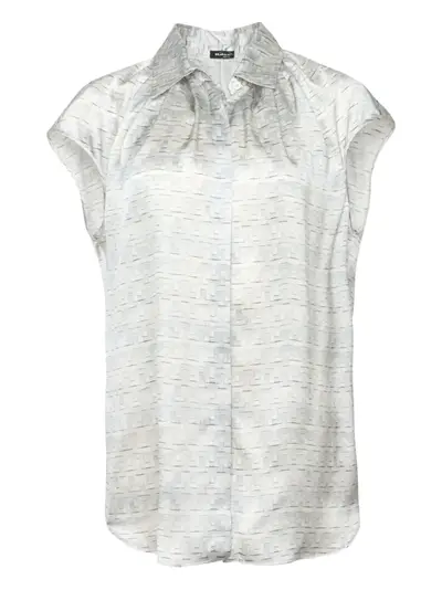 grey short sleeves collared neck button fastening geometric print gathered back yoke
