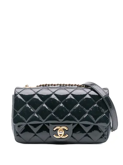 quilted patent leather body curb chain strap with leather guard front flap with interlocking Cs and twist lock closure exterior back slip pocket interior zip pocket blue Serial Number: 21371926 Inclusions: authenticity card. Condition: GOOD. This previously owned and used item is in good condition with minimal signs of use. This may include fading of material or plating and scratches. Declared Damages: Exterior Top Feature(s) Moderate Wear. Exterior Back Feature(s) Minor Loose Stitching. Please refer to the photos on this product page for a detailed view of the item, including any damages declared.