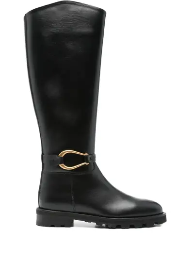 black leather upper gold-tone buckle detail knee-high shaft round toe