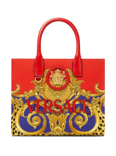 red baroque print leather handles gold-tone accents natural cotton medusa head emblem