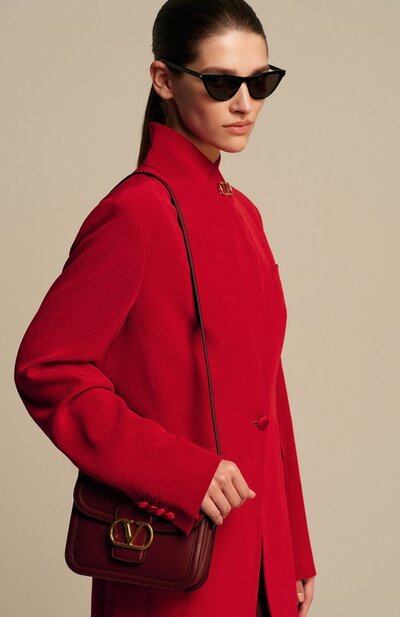 Сумку 9TO5 с тремя внутренними отделениями и карманом дополнили съемным плечевым ремнем. Клапан аксессуара, выполненного из телячьей кожи, украсили металлической эмблемой VLogo Signature.