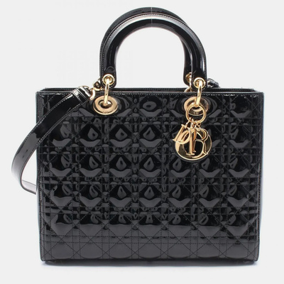 Bold, luminous, and unapologetically refined, this large Lady Dior handbag reinterprets a house icon with high gloss allure. The Cannage stitching—synonymous with Dior’s couture roots—adds texture and tension to the polished black patent finish. Meant for the woman who knows that classic isn’t a look—it’s a legacy.