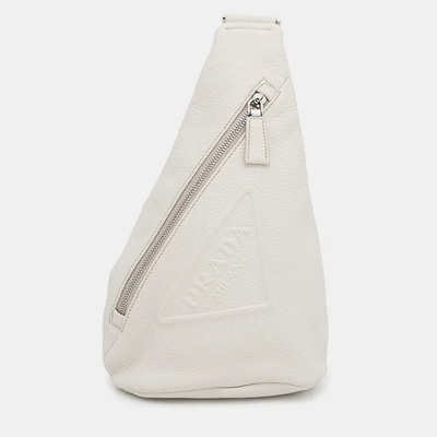 Graphic, angular, and instantly recognizable, this Prada crossbody transforms the brand’s signature triangle into wearable geometry. In pristine white leather, it becomes a statement of modern minimalism—striking yet subtle, structured yet effortless. Designed for those who speak fluent fashion with few words.