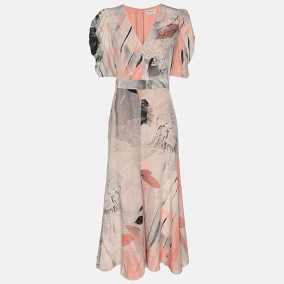 An artistic masterpiece, this Alexander McQueen midi dress showcases a striking trompe l’oeil print across fluid silk. The puff sleeves add sculptural drama, while the vivid palette transforms the silhouette into a statement of avant garde elegance.