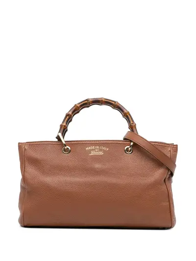 leather body bamboo top handles detachable flat leather strap open top with a magnetic closure interior zip compartment interior zip and slip pockets brown Serial Number: 323660 520981 Inclusions: shoulder strap. Condition: GOOD. This previously owned and used item is in good condition with minimal signs of use. This may include fading of material or plating and scratches. Please refer to the photos on this product page for a detailed view of the item, including any damages declared.
