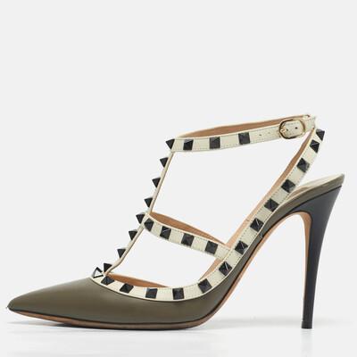 Valentino delivers edge in these two tone ankle strap pumps, finished with signature Rockstud detailing for bold, structured sophistication.