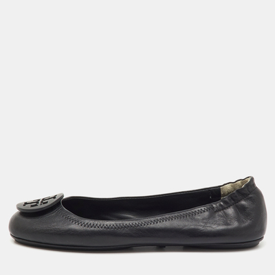 An everyday classic, Tory Burch’s Reva ballet flats are designed in black leather with an elastic scrunch back for comfort. Finished with the signature gold tone double T logo medallion, they bring polished ease to versatile styling.