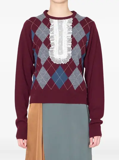 burgundy argyle pattern lace insert round neck long sleeves ribbed cuffs