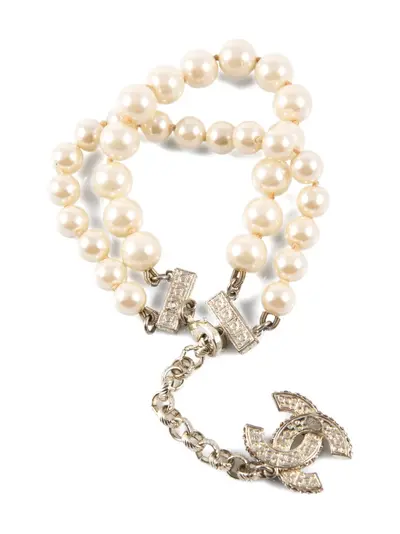 2000s ivory faux-pearl embellishment double-strand chain detail crystal-embellished logo Condition: GOOD. This previously owned and used item is in good condition with minimal signs of use. This may include fading of material or plating and scratches.