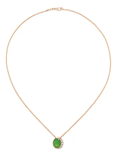 18K rose gold pavé setting round-cut 0.10 carats white diamonds chrysoprase embellishment lobster clasp fastening Normal everyday use and external agents may reduce the lustre of gemstones and gold surfaces. To maintain, use specific, non-abrasive products specially meant for cleaning jewellery. Pearls should be the last thing that you put on in the morning and the first thing you take off at night. Avoid contact with perfumes or creams, and simply wipe with a soft cloth to clean.