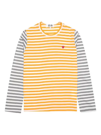 yellow cotton horizontal striped pattern long sleeves crew neck embroidered red heart patch