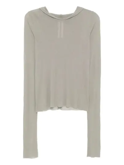 pearl grey ribbed texture hooded neckline long sleeves raw-cut hem