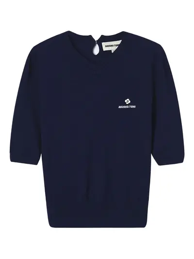 blue puff sleeves keyhole detail logo print V-neck short sleeves