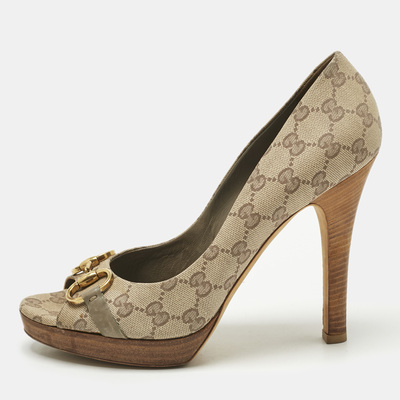 Gucci Beige GG Canvas And Leather Horsebit Peep Toe Pumps Size 41 1204064 (бежевый, lpn30854813)