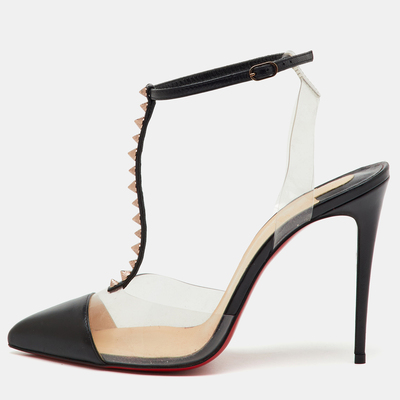 Christian Louboutin Black Leather and PVC Nosy Spikes T-Strap Sandals Size 38 1202861 (чёрный, lpn30855105)