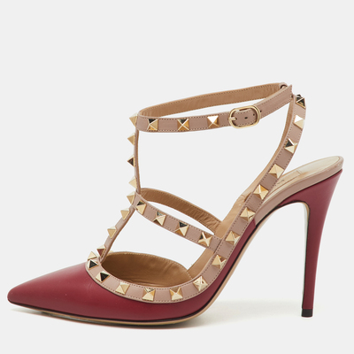 Valentino Red/Beige Leather Rockstud Ankle Strap Pumps Size 39.5 1201730 - 1