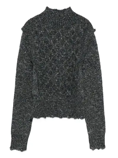 grey high neck jacquard knit ruffled cuffs and hem long sleeves