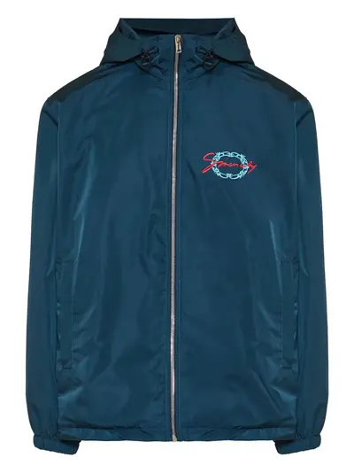 petrol blue hooded neckline zip fastening logo embroidery long sleeves