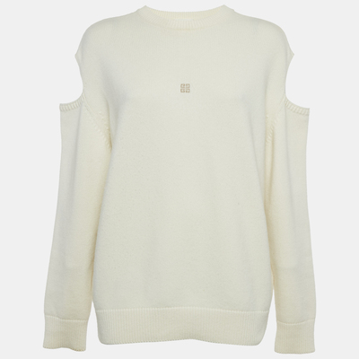 Givenchy elevates cozy knitwear with a contemporary edge in this cream sweater. Crafted from a luxurious wool and cashmere blend, it features an intarsia logo detail and chic cold shoulder cutouts, offering a perfect balance of comfort and modern sophistication.