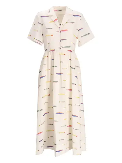 off-white linen short sleeves collared neckline button fastening all-over sardine print gathered waistline