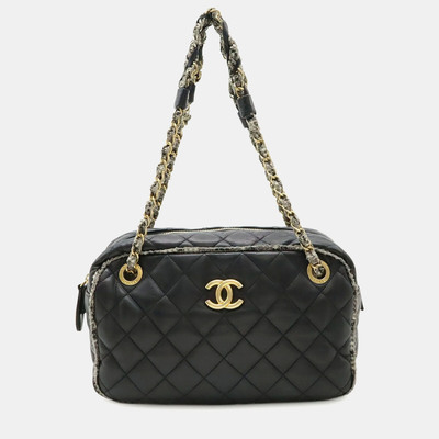This Chanel shoulder bag features a mix of lambskin leather and tweed fabric with gold tone chain hardware. Its compact design makes it suitable for both casual and evening use.