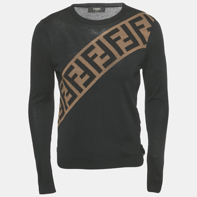 Fendi reimagines knitwear with this black wool pullover featuring the signature Zucca intarsia motif. The close fit and fine construction combine warmth with bold branding. Designed to layer seamlessly, it pairs easily with skirts, trousers, or denim.