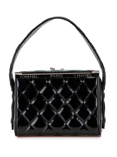 quilted patent leather body flat leather handle flip-lock clasp closure interior slip pocket black Serial Number: 4151535 Inclusions: authenticity card. Condition: GOOD. This previously owned and used item is in good condition with minimal signs of use. This may include fading of material or plating and scratches. Please refer to the photos on this product page for a detailed view of the item, including any damages declared.