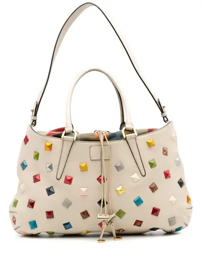 studded leather body rolled leather handles flat leather shoulder strap open top with drawstring closure interior zip pocket white Serial Number: 8BN237 B0P 128 2516 Inclusions: shoulder strap. Condition: GOOD. This previously owned and used item is in good condition with minimal signs of use. This may include fading of material or plating and scratches. Declared Damages: Handle/Strap Feature(s) Minor Peeling. Please refer to the photos on this product page for a detailed view of the item, including any damages declared.