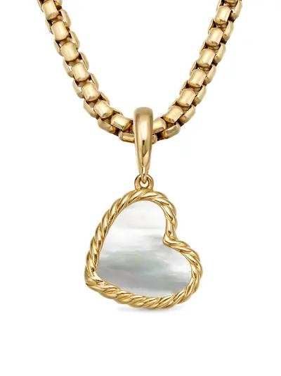 gold-tone 18K yellow gold mother-of-pearl heart twisted border polished finish Normal everyday use and external agents may reduce the lustre of gemstones and gold surfaces. To maintain, use specific, non-abrasive products specially meant for cleaning jewellery. Hallmarked in the United Kingdom at the London Assay Office. To ensure the shine and polish of your David Yurman piece, wash with a little non-bleach, soapy water and wipe clean with a soft cloth. Pearls should be the last thing that you put on in the morning and the first thing you take off at night. Avoid contact with perfumes or creams, and simply wipe with a soft cloth to clean.
