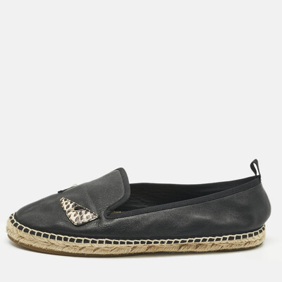 Playful yet edgy, these Fendi espadrilles feature smooth black leather and exotic water snakeskin accents. The brand’s signature Monster Eyes motif adds a bold statement, while the classic espadrille sole ensures comfort and casual sophistication.