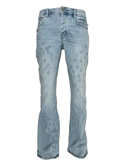 light blue embossed logo pattern flared leg button fly
