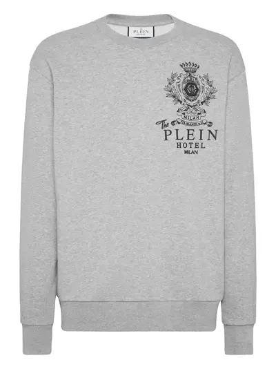 grey crew neck crest embroidery back print long sleeves