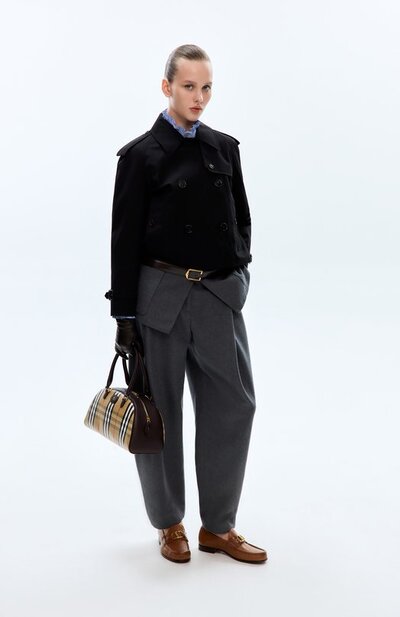 Двубортный кроп-тренч с отлетной кокеткой, ружейным клапаном и погонами сшили из хлопкового габардина с водоотталкивающей обработкой. Модель кроя Relaxed fit дополнена подкладом в клетку Burberry Check и двумя боковыми карманами.