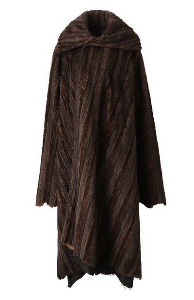 Свободную шубу с удлиненными рукавами и глубоким запахом, фиксирующимся пуговицей под отложным воротником, дополнили боковыми карманами. Асимметричную модель с необработанными краями и выступающим подкладом с бахромой сшили из экомеха, напоминающего стриженую норку.